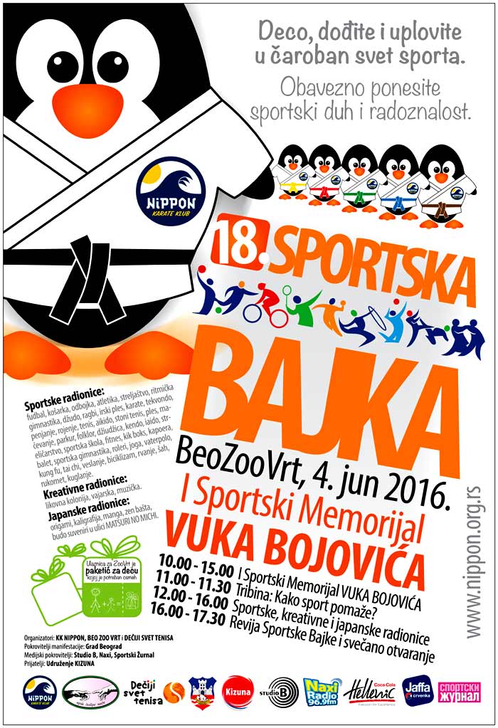 Osamnaesta SPORTSKA BAJKA će se održati 4. juna 2016 god. u Beogradskom Zoo Vrtu, u organizaciji karate kluba Nippon i Beo Zoo vrta. Ovo je manifestacija od posebnog značaja za Grad, podržana od strane Ministarstva omladine i sporta RS i Kancelarije za mlade. Manifestacija je usmerena na promociju i razvoj sporta mađu mladima i ima za cilj da na zanimljiv i popularan način uključi što više dece u sport i uputi roditelje na značaj pravilnog bavljenja sportom, posebno kod dece predškolskog i školskog uzrasta.
