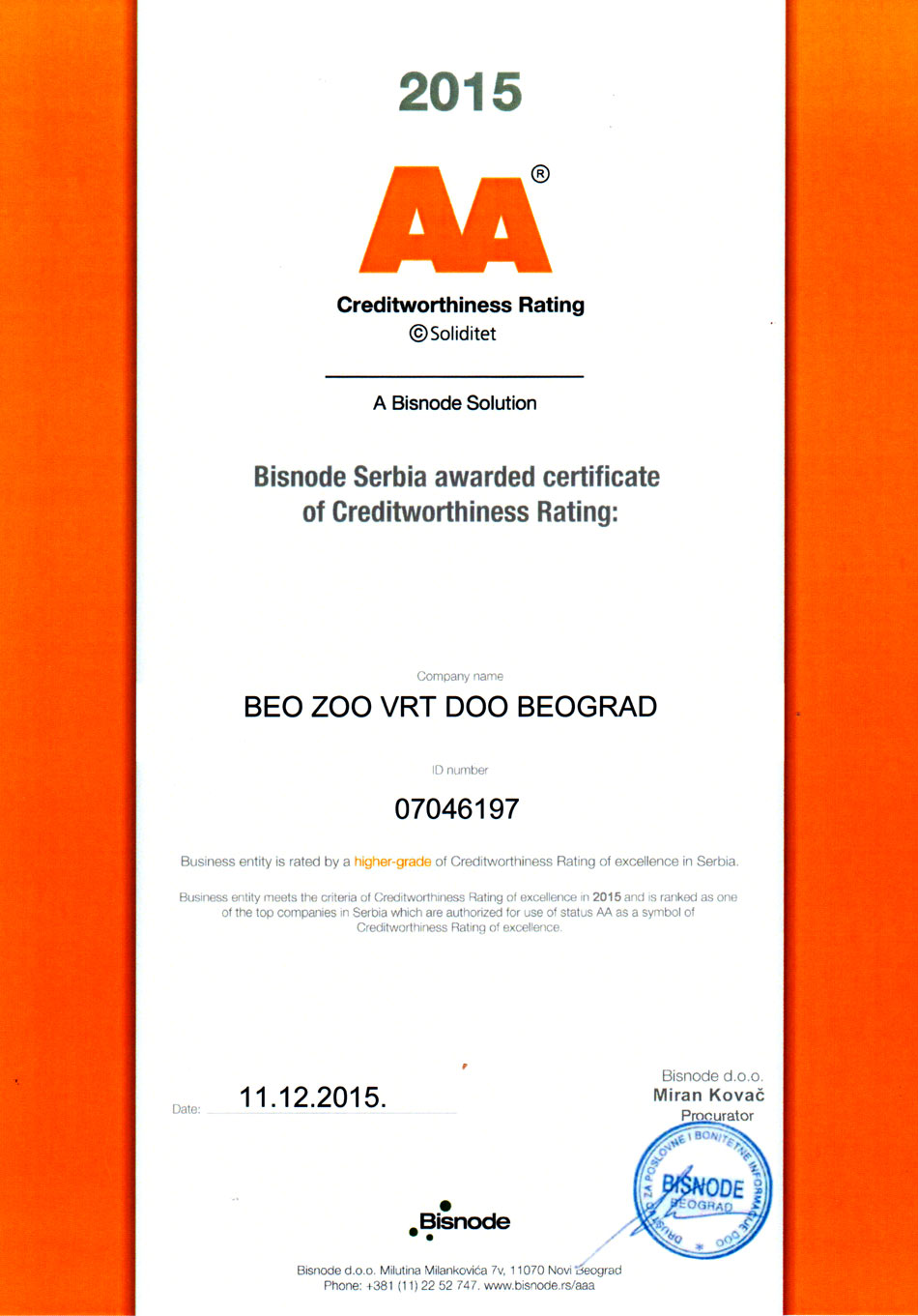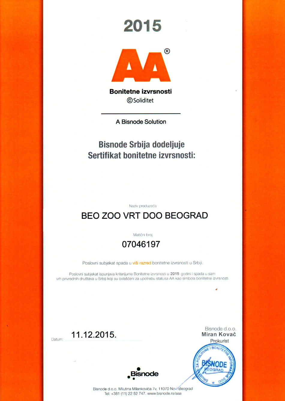 Zoološki vrt grada Beograda je 11. 12. 2015. godine, od Bisnode Srbija, dobio Sertifikat bonitetne izvrsnosti. Ovo visoko rangiranje pokazuje da Beo Zoo Vrt ispunjava kriterijume Bonitetne izvrsnosti u 2015. godini i spada u sam vrh privrednih društava u Srbiji.
